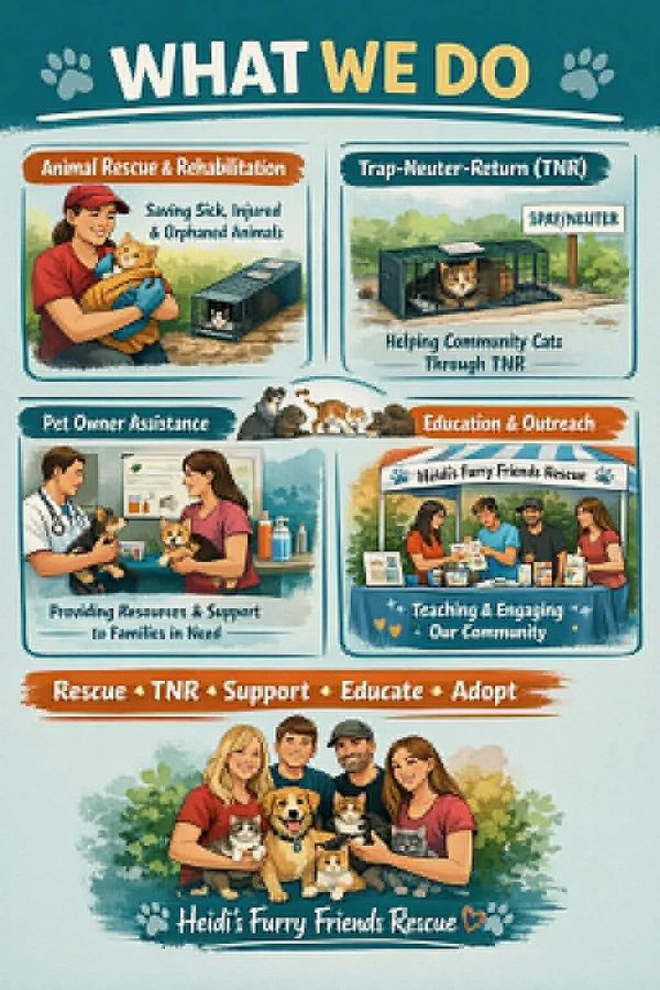 Heidi’s Furry Friends Rescue is a foster-based, nonprofit animal rescue founded in Williamsport, Pennsylvania, out of a simple but powerful need — animals were suffering, and someone had to step up. What began as one person helping wherever possible grew into a rescue built on compassion, action, and community support. Our team is intentionally small and deeply hands-on. We operate with five dedicated foster homes, along with Heidi and her family — her two sons, daughter, and fiancé Patrick — all working together to care for animals who have nowhere else to turn. Every rescue, feeding, vet visit, late-night emergency, and success story is personal to us. What we do goes far beyond adoption. We focus on rescue and rehabilitation, Trap-Neuter-Return (TNR) for community cats, public education, and helping pet owners in need access care and resources. We believe lasting change happens when animals, people, and education come together — and we are committed to doing that work every single day.